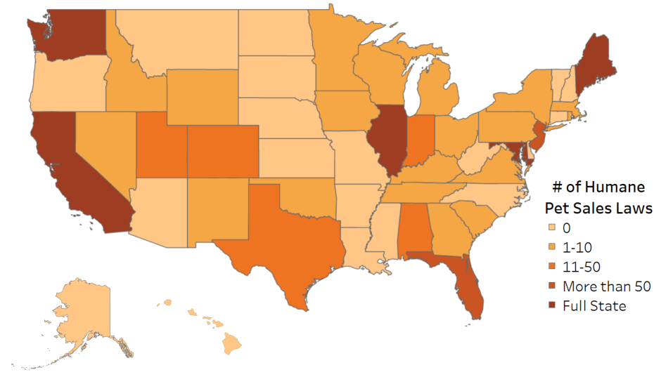 Humane pet sales laws are an effective way to put the squeeze on commercial breeding operations — i.e., puppy mills and kitten mills. These laws prevent pet stores from selling puppies and kittens from breeding mills, which shrinks the market for inhumanely bred pets to be sold.