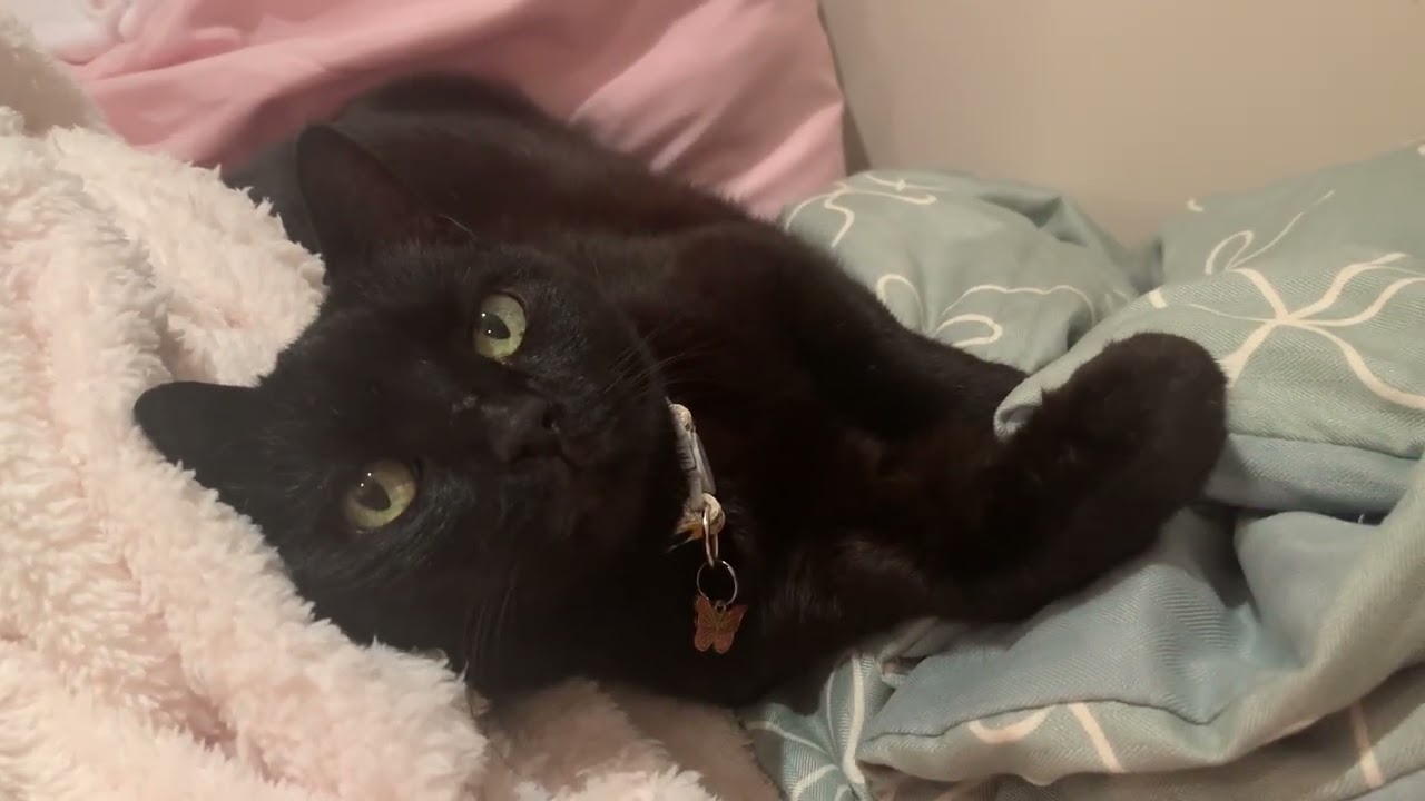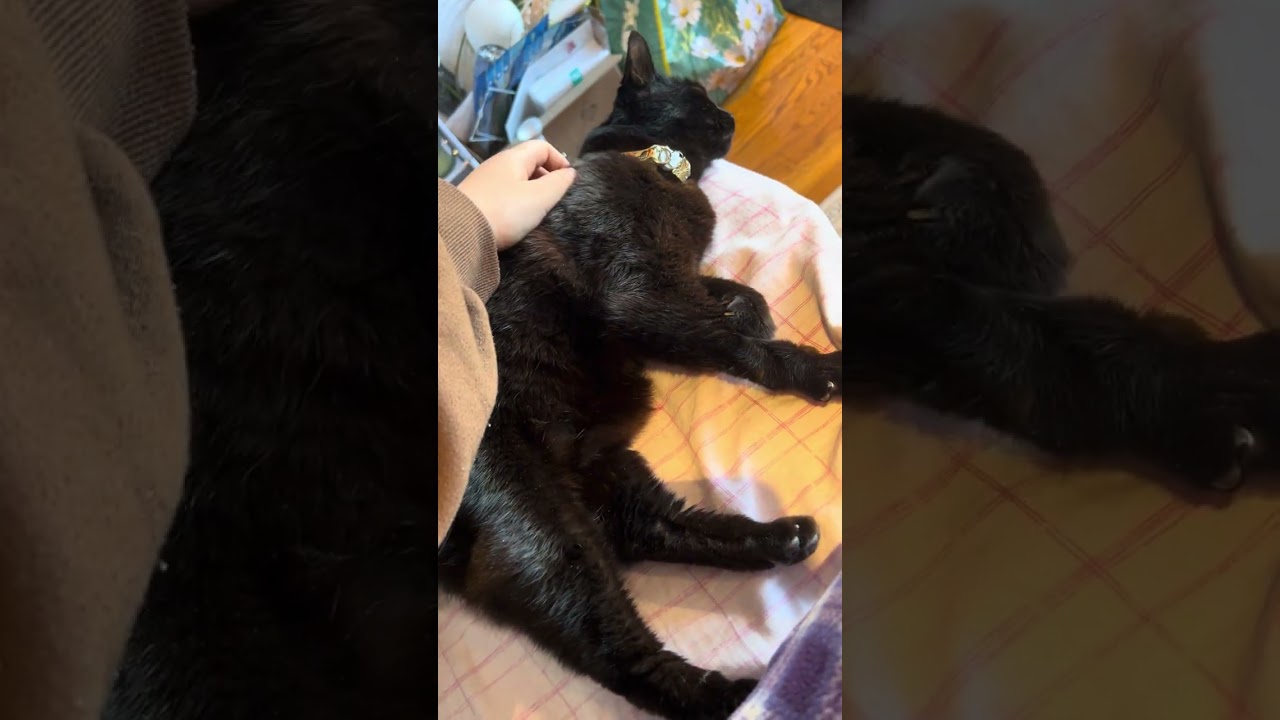 Belize is the sweetest cat. She has beautiful black fur, big green eyes, and the softest coat. She has a calm and affectionate personality and is friendly to everyone she meets. She loves attention, has a soft purr, and makes biscuits when she’s happy (even in the air while lounging on her side).