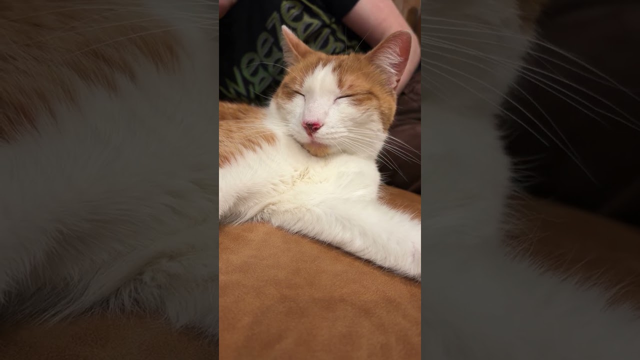 His foster says "When Romeo arrived home, he was curious about everything and everyone. A complete 180 from the shelter. He was a bit nervous but not fearful. Within an hour, he was lounging by my side and purring. He loves to look out the window, chase his toys and sleep curled up near my head at night. He spends the whole night, and he’s so soft and cuddly. He likes pets but is sensitive around his stomach/tail and will hiss or get a little slappy or nibbly to let you know he doesn’t want to be touched there. But nothing malicious or frightening. He enjoys exploring but to my relief hasn’t knocked anything over or gone after my plants. He goes crazy for freeze-dried chicken treats and likes to use his cardboard scratcher. He’s so cute at night. When I get into bed, he immediately jumps up knowing that it’s time for sleep. And he’s a great mix of active and being a lounger in his cat bed.". He is a super sweet and snuggly guy, a great companion.