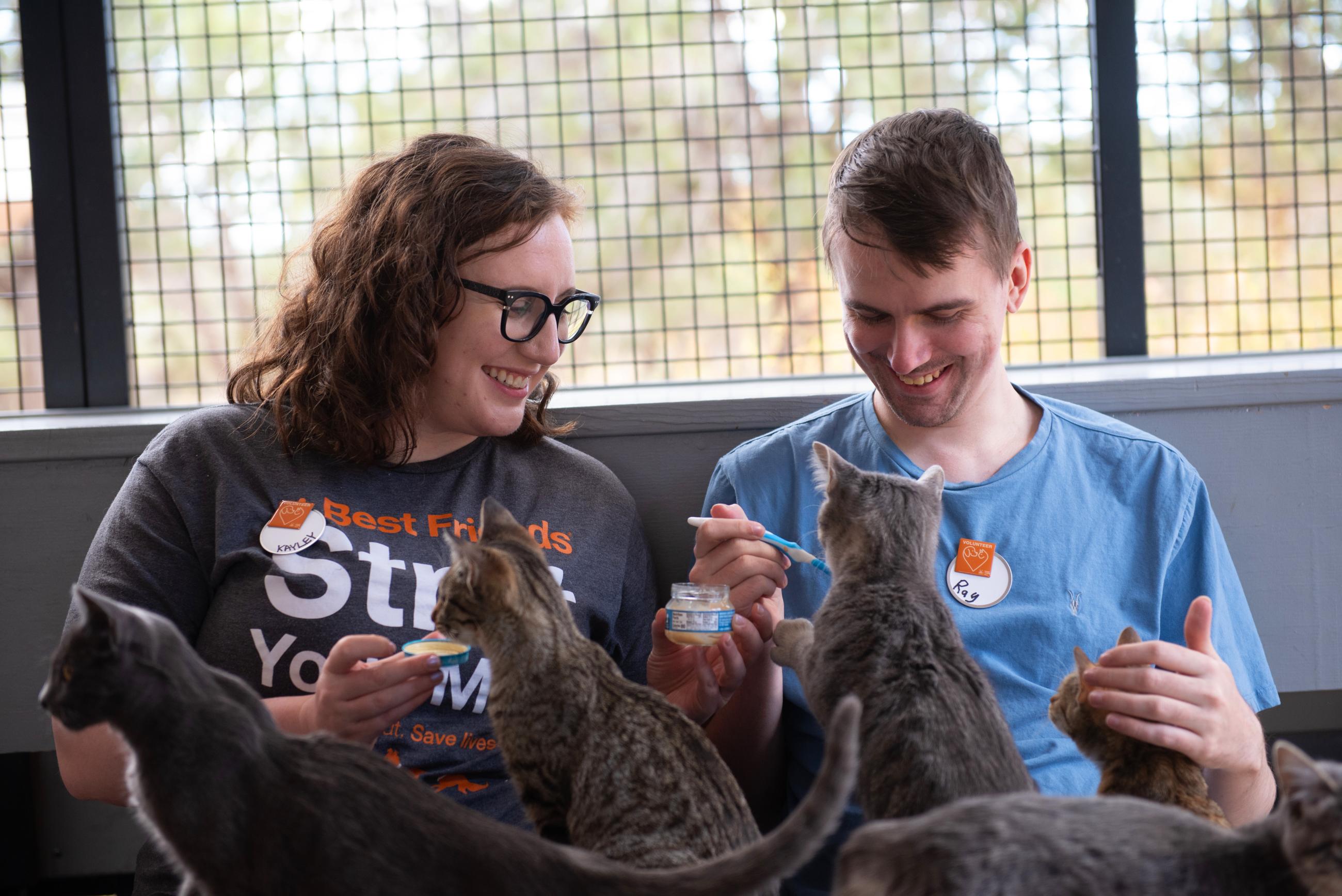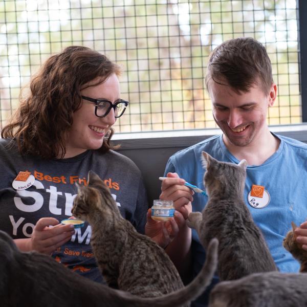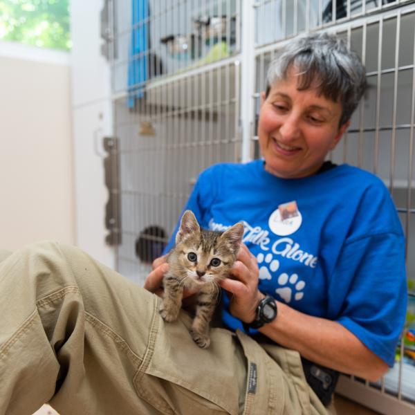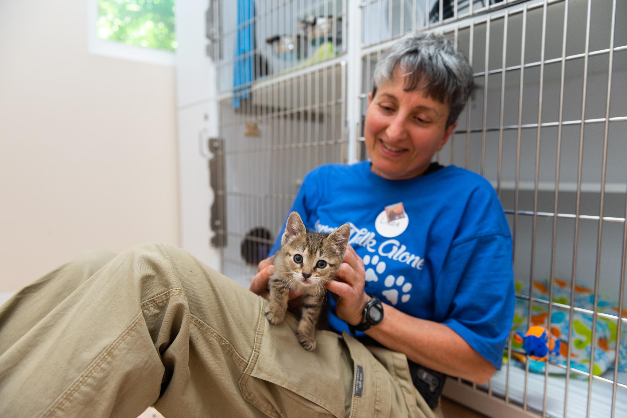 During a shift at the adoption hub, you might help with cleaning the dog spaces and cat room, dishes, laundry, sweeping and mopping, cleaning litter boxes, taking dogs for walks, and socializing the animals.