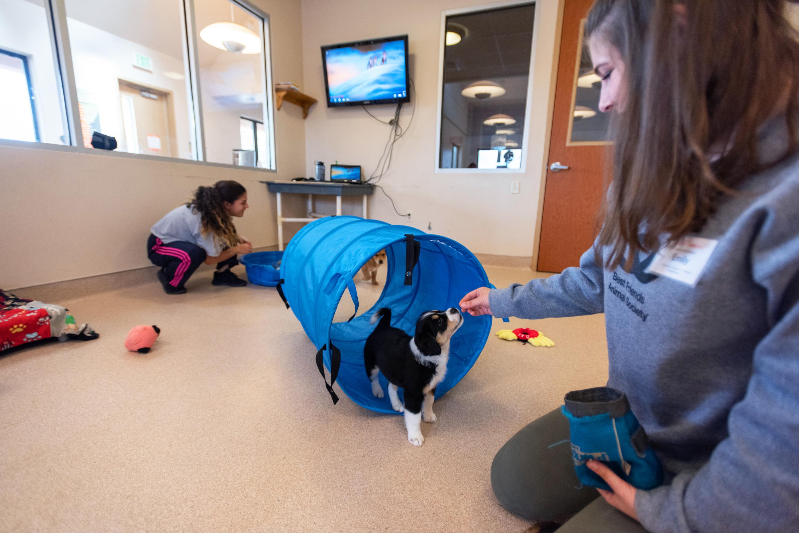 Volunteers are also welcome at the adoption hub inside puppy preschool, where cats and dogs reside while they wait to be adopted.