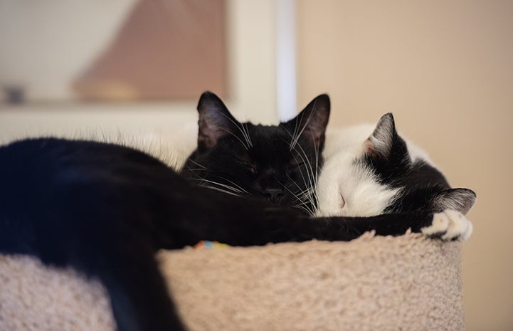 Spatz and Maisie know how to keep warm during a long, cold winter in southern Utah. Both of these kitties used to be a bit shy around other cats when they first arrived at the Sanctuary, but it’s obvious from their cat tree snuggle sessions that they’ve won each other’s hearts — and ours.