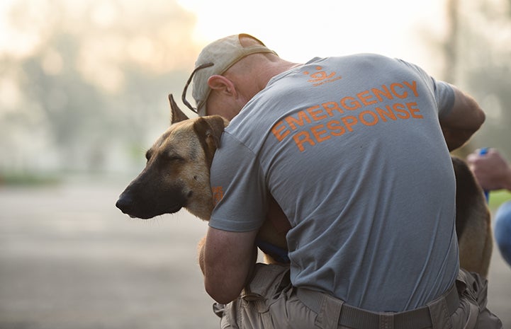 5. John Garcia comforts a pregnant German shepherd displaced by the hurricane.