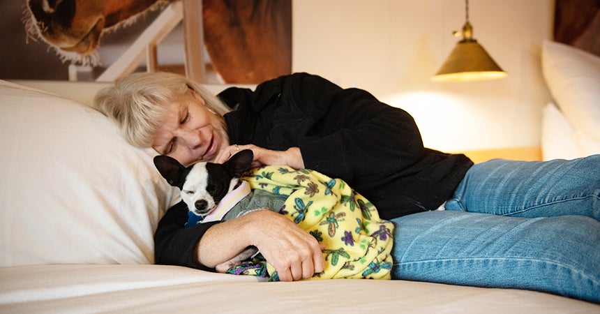 The contented look on Robert Johnson’s face as he burrowed deeply into the arms of Cat World caregiver Julie Contival said it all: The little dog couldn’t have been any happier to be on his very first sleepover. Just a few hours earlier, he and Julie had checked into the Best Friends Roadhouse and Mercantile. They were among the very first guests of Best Friends’ new hotel during its soft opening on the evenings of October 28 and 29.