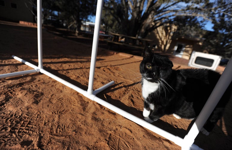 But Orson's spirit prevailed. Though he'd been traumatized and scarred by his injuries, he adapted very quickly to his new environment. It wasn't long before he became a staff favorite in Sinjin's, a building in Cat World for cats who are working to lose weight. But Robin said that Orson really wanted to be outside; he would often stand by the door and meow to be let out. Once in the sandy yard behind Sinjin's, Orson felt his way around until he became familiar with the space. Still, his caregivers set him up in a screened kitty "tent," so that he could enjoy the outdoors without getting lost or injured.
