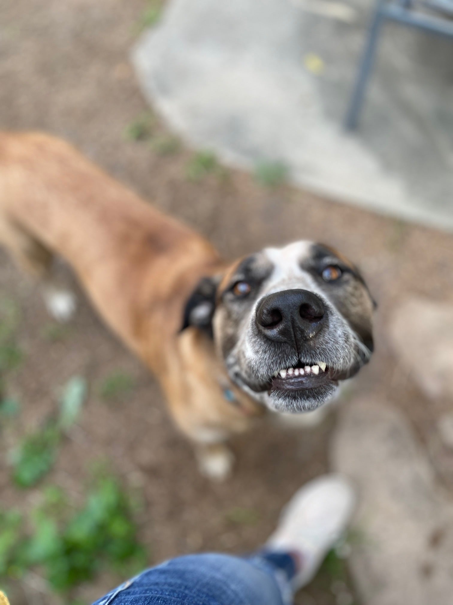 Then she saw a dog named Brutus who was there as part of a Best Friends in Houston adoption event. Brutus’s massive grin made her want to meet him, but it was his story that made her want to give him a home.