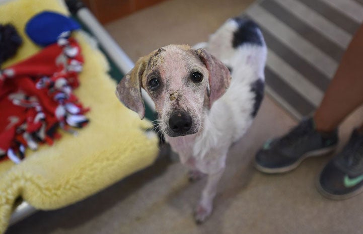 Kirby was living with many other animals before Hurricane Harvey hit, and when that happened, he lost his home. Not only would the little dog need a new home, but he would also need a lot of medical care and TLC. He was in rough shape, was quite underweight and was missing much of his fur due to a case of demodectic mange.