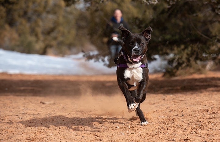 Bonneville joined the search and rescue fun for the enrichment and to burn energy. Since she is more motivated by play than food, her reward for uncovering the hidden person is playing a few rounds of fetch. The built-in breaks after every few runs are definitely for the people involved.
