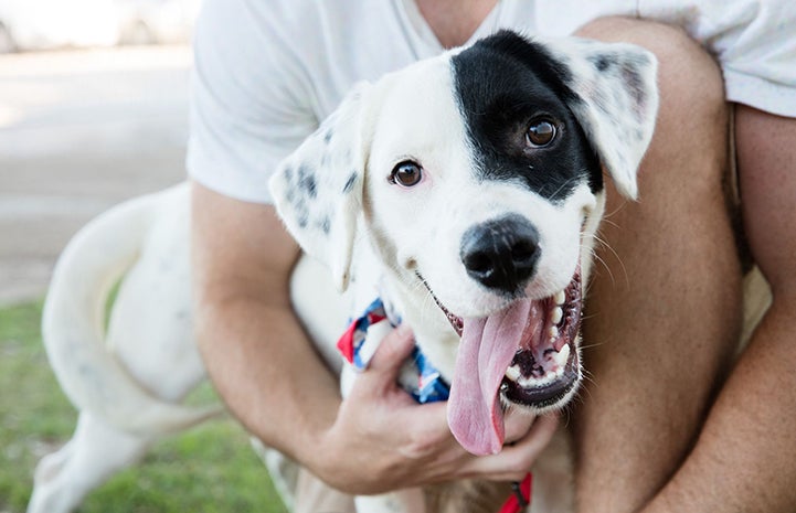 He learned that he could foster a dog, but he didn’t take that decision lightly. He went home to think about it, and he looked through hundreds of photos of the pets Best Friends is caring for at NRG Arena. He was soon on his way back there to bring home just about the cutest black and white dog with a huge smile.