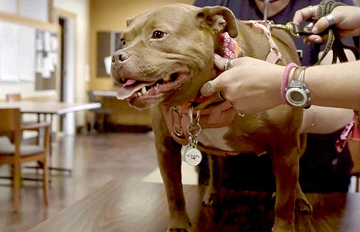 Vaccinations being given to a brown and white pit bull type dog by two people