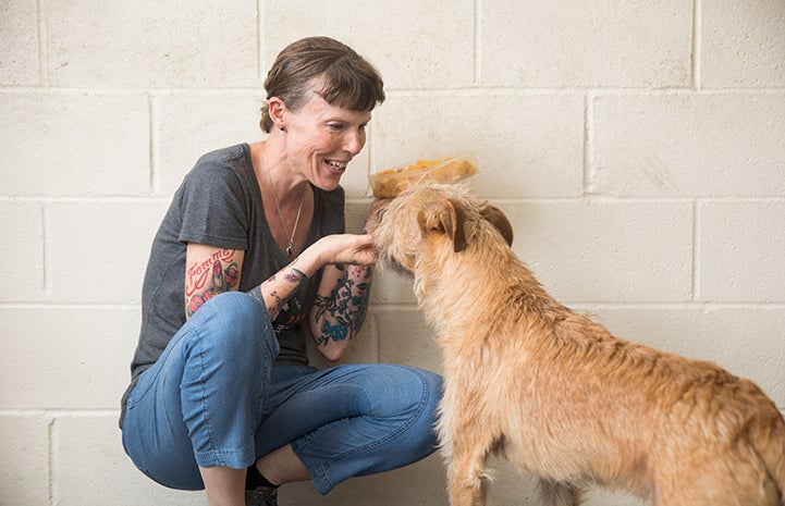 The four parks and rec dogs are just as unique as their namesakes. As one might expect, Tom Haverford warmed to people quite quickly. After a bit of reassurance, he began to trust people, and it wasn’t long before he moved out of the adoption center into a home of his own, where his new name is Elvis. Ron Swanson, Leslie Knope and Ann Perkins would need a bit more time to turn around. To help the parks and rec dogs, the team uses hand target training, a method that works for all dogs, but is especially effective for the shy ones who are fearful of people.