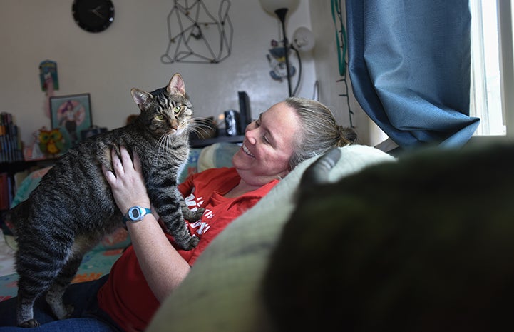 Heather has lived with RJ and Koda for years. Koda, now 11, came to Best Friends and went home with Heather in 2012. Nine-year-old RJ followed a few years later. Both cats are brown tabbies, and while neither of them is in any pain, they both became incontinent from injuries (Koda from BB gun pellets and RJ from a car accident).