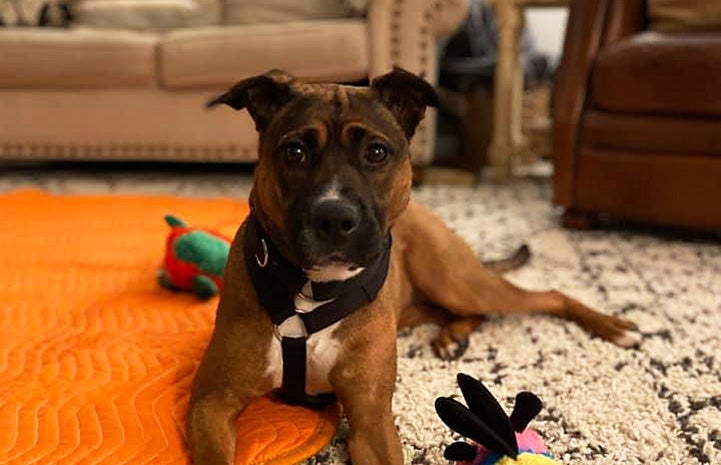 Man cuddling with Almond the dog while on the floorAlmond is just the coolest. The young dog loves to cuddle as much as she loves to play. She’s a fast learner, a great listener and she doesn’t mind helping her foster family with their downward-facing dog yoga poses.