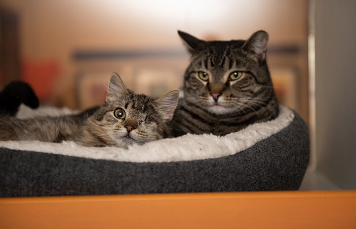 One morning when staff arrived, there was Peyton curled up next to Buzz, another cat in her room. Until Peyton arrived, Buzz had been a bit of a loner, but he took to his new kitten friend, grooming her and sharing his bed.