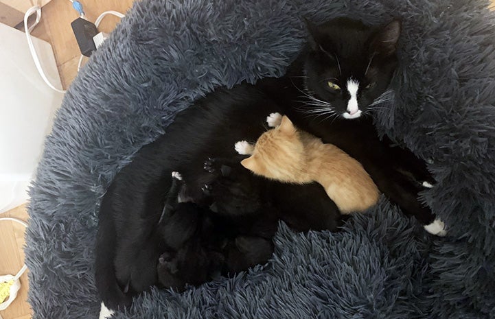 It was a longshot, but veterinarians tried putting tiny Arnie with mama Callie and her litter to see if she’d feed him. The minute she saw his little orange face, Callie accepted Arnie as her own. Soon he was tucked in next to his new brothers and sisters. He might be a different color than his new littermates, but that only makes him extra adorable, and easy to spot in photos and videos.