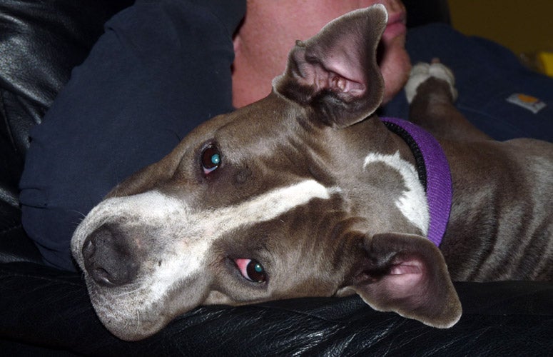 Gale Frey, founder of Mutts n Stuff, has been rescuing pit bull terriers, especially those most at risk, for many years. She was one of the first people to get the call about the need for assistance. Her group took in Fay, who became a poster pup against dogfighting, along with Farnsworth and about 50 other dogs. "Farnsworth's body was broken, and he was so shut down, but we've seen him come around," says Gale. "He loves being with us, and he loves snuggle time. He's still a little anxious inside, but he's like a different dog now."