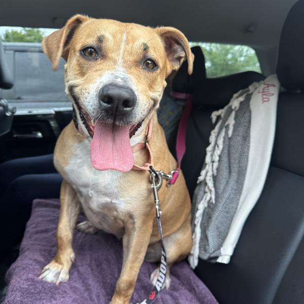 One pet who came to the pet resource center ahead of time was Mackenzie, a tan-and-white dog with a smile so big it could have been drawn by a caricature artist. She’s 50% fetch superstar, 50% couch potato, and 100% good girl. Mackenzie found herself at a shelter where she was cared for and adored by every staff member. No one could understand why month after month passed without Mackenzie being adopted.