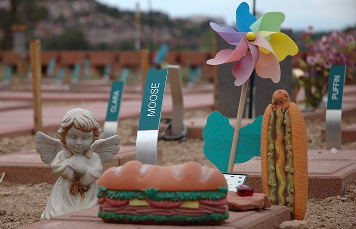 The gates at the entrance depict a dog and cat with rabbits perched on their backs, surrounded by flowers in bloom. Stones and markers bear tributes like, "Always in our hearts," "the best wee cat in the whole wide world," and other loving sentiments.