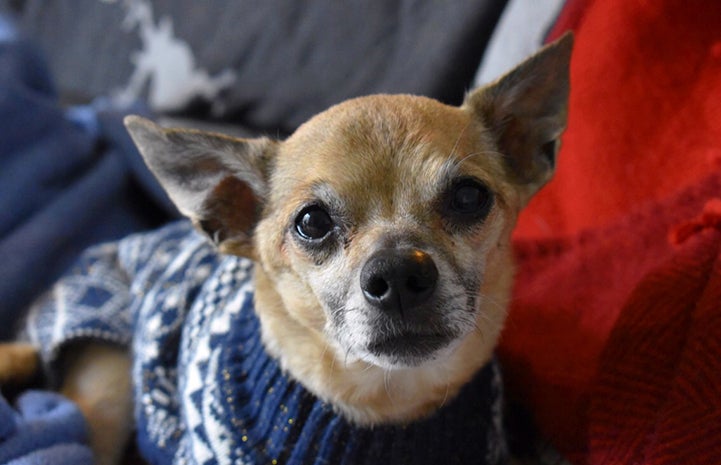 Griff, a senior Chihuahua, was recently adopted from the Best Friends Pet Adoption Center in New York City, and today he shares a home with two fellow Chihuahuas and two cats, including one who likes to playfully bop him on the muzzle from time to time.