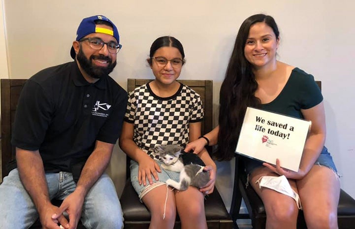 Almond Joy the black puppy being held by a young girl next to her dad after adopting the pup
