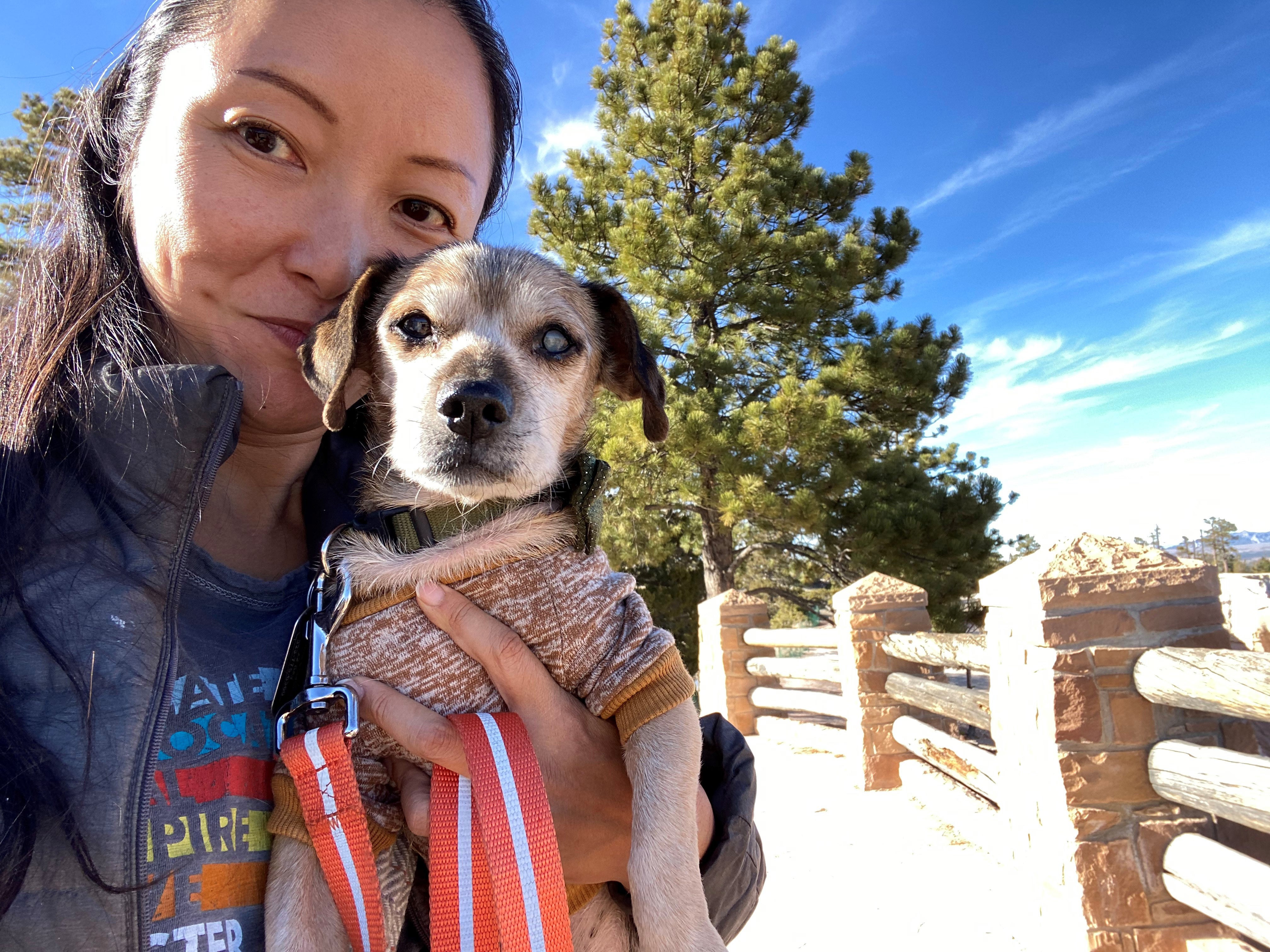 Ranko holding Soba the senior dachshund in front of a pine tree and blue sky