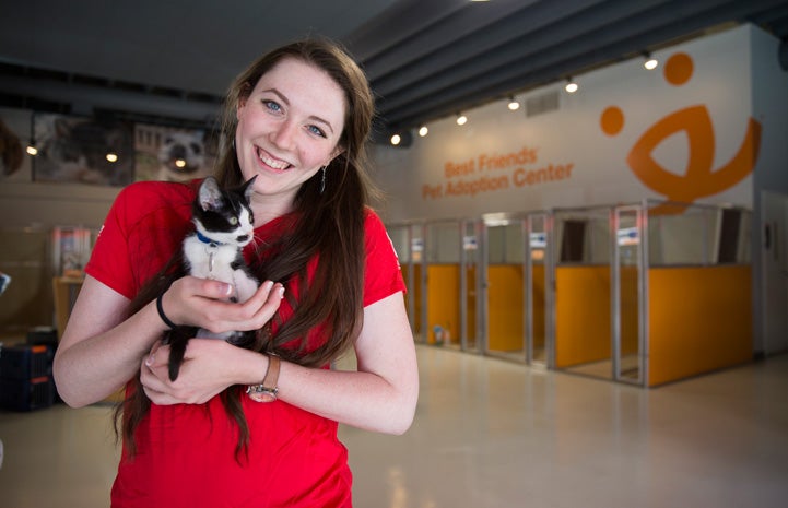 Although Sarah Mohalley wasn’t actively looking to adopt a new kitten, when she learned about Lego on the Best Friends website, her heart melted. Immediately smitten, she felt she needed to meet the little black-and-white ball of fluff. That’s all it took for him to win her heart. “I was sold the second he wobbled toward me in the playroom at Best Friends,” she says. And it turned out she was uniquely qualified to take him in.