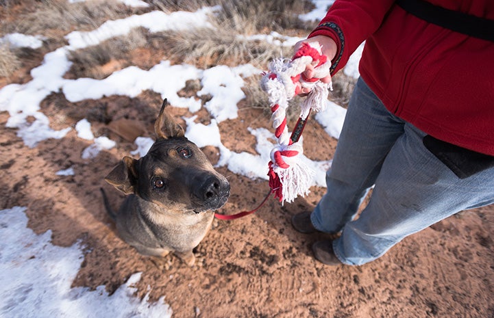 First, his caregivers gave him a large, sturdy rope toy. “Ruger thought that was the cat’s meow,” says Dogtown caregiver Tom Williams. The silly senior boy was beyond thrilled to have something to play with again. He worked hard to prove to his caregivers that he could be trusted not to destroy and then eat the toy. Instead, Ruger proudly carried the knotted rope around his room, as well as outside on his walks.