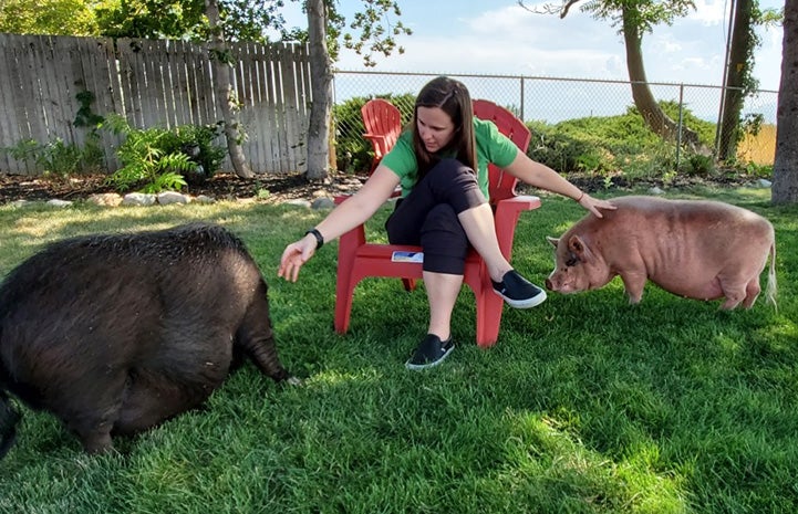 Diesel and Papa (renamed Boulder) settled into their new home almost immediately. They each had their own shed to sleep in and a grassy yard to snuffle and root around. When it was warm enough, Jennifer would lay down in the grass, a pig on either side of her, and the three enjoyed the sunset together.