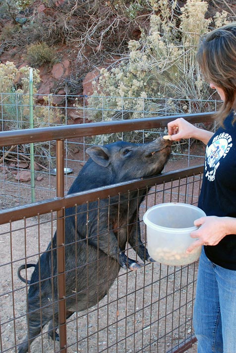 Remember Jack? He’s grown up a little bit since you last saw him, perhaps. (All that love of eating has paid off!) For a time, Jack was the go-to pig for harness walks. Man, did that guy have a busy social calendar. Visitors and volunteers would take him out for walks around Horse Haven, often ending up at the Welcome Center (the part of the sanctuary where visitors can learn about Best Friends and take a tour if they like). And really, who could be more welcoming than a charismatic potbellied pig on a leash? He was always the main attraction wherever he showed up.