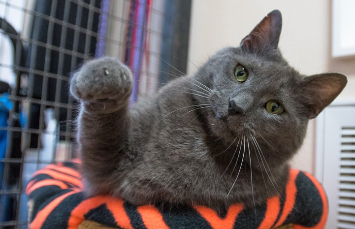 Each day, he wears his winning smile and a bowtie while greeting visitors. It seems that no one can resist the handsome Russian blue cat with the red bowtie looped smartly around his neck. Often, he’ll lounge on his Kuranda bed and beg treats and pets from everyone who stops by.