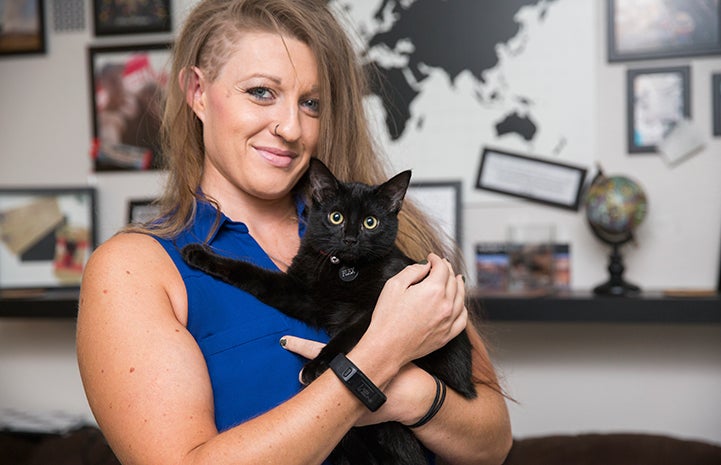 That could be why Tawnya Stewart didn’t see Flex at first. Tawnya had come to the center one September afternoon with her boyfriend looking to adopt a black kitten. Flex was in his favorite safe place — at the back of a cubby. When she eventually did spot him, she immediately recognized a familiar look: fear.