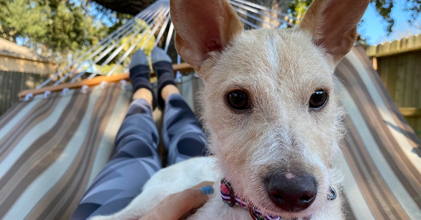 Scruffy pup goes from scared and broken in an overcrowded shelter to healing on a hammock