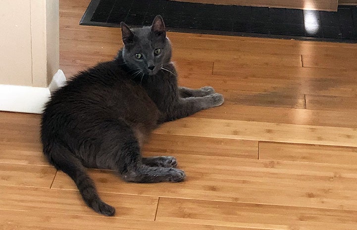 Wrinkles took no time at all making himself at home, and Jenny says they’re all settling into a groove. He’s loving life, following Jenny around the house, stretching out on the floor in the sun and jumping up on the counters to prove that he’s still just as spry as a younger cat.