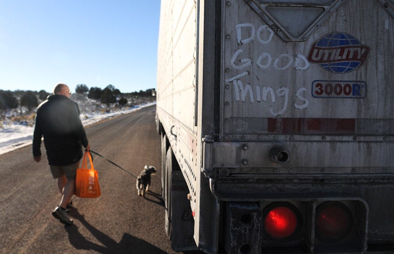 It was a match as far as personalities go, but there was one more test Garrett would have to pass before he could ride off into the sunset. Dogtown caregivers and adoption specialists watched in anticipation as Thom brought Garrett out to the "rig" to see how he'd react to it. Garrett wasn’t going to pass up this opportunity; he sauntered right up to that semitruck like he'd been around it for years.