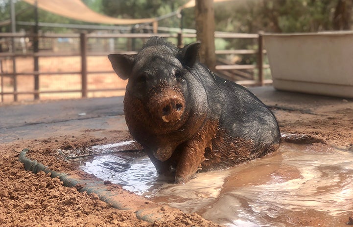 So, while Mary Jane still has a long way to go until she’s rolling over for belly rubs and back scratches like some of the other pigs, she’s already come quite far from the scared, quaking pot-bellied pig picked up by Don at the shelter. Soon, she’ll be spayed and playing with the other pigs. And with help, bit by bit, she’s starting to feel a little more in her safe, muddy element.