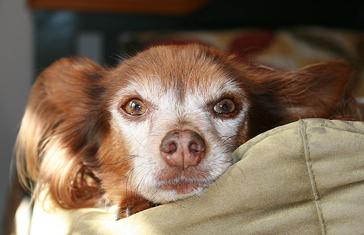 Today, CiCi’s copper-colored coat is streaked with gray, and she moves a little slower. Now the same love and patience that was needed to help CiCi adjust to her new home is coming into play again, as Carolyn helps CiCi adjust to the health challenges of life as a senior dog.