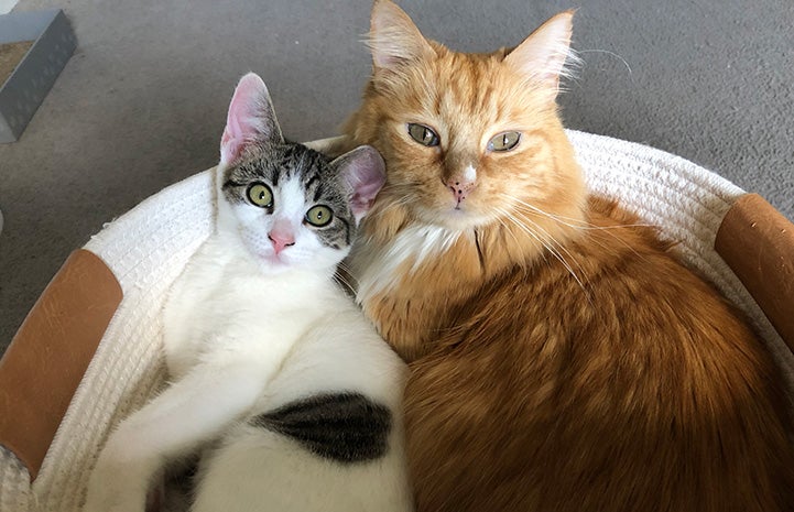 The orange cat instantly put the kitten at ease by calmly approaching her carrier and slowly circling it until Santa Fe moved to return the greeting. After that, the two cats were buddies. They ate together, napped together and played together constantly.