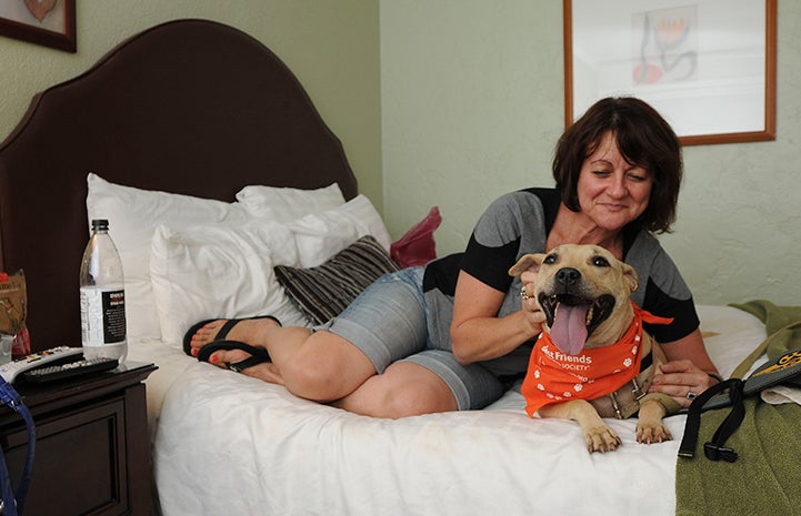 While hanging out with Kim and Mark in one of the Best Friends cottages, Joy enjoyed a snuggle session on the couch. “She's super sweet, snuggly, affectionate and, of course, her adoring smile is irresistible,” says Kim. Then, instead of demanding more attention, Joy entertained herself by chewing on a Nylabone while Kim and Mark relaxed nearby. "We love Joy!" says Mark, and Kim adds, “I'd nickname her Miss Congeniality.”
