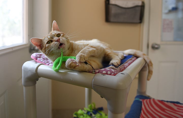 Once she was well enough, Odette was transferred to Cat World, where she could enjoy lots more space and comfort. Although her health is still being monitored closely by Best Friends caregivers and vets, she’s feeling much better these days. During all the months of medical care and recovery, Odette kept up her happy, outgoing attitude. Now, she’s finally releasing all her pent-up kitten energy ― dashing after feather toys and leaping up on cat trees.