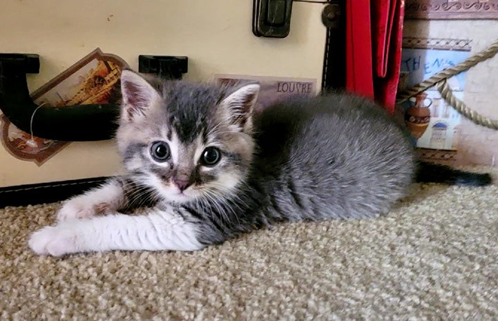 The orphaned kitten had swimmer’s syndrome, a condition that makes it impossible to walk due to weak muscles in the back of the legs. Instead of Kramer’s back legs holding him up, they splayed out to the sides. More commonly found in puppies than kittens, swimmer’s syndrome gets its name from the fact that the back legs look like a swimmer about ready to kick. Left untreated, it can be life-threatening.