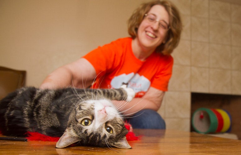 Julie Brueck with Oso the tabby catKristina Stromness, volunteer coordinator for Best Friends Animal Society–Utah, sings the praises of volunteers like Julie and Kathy.
