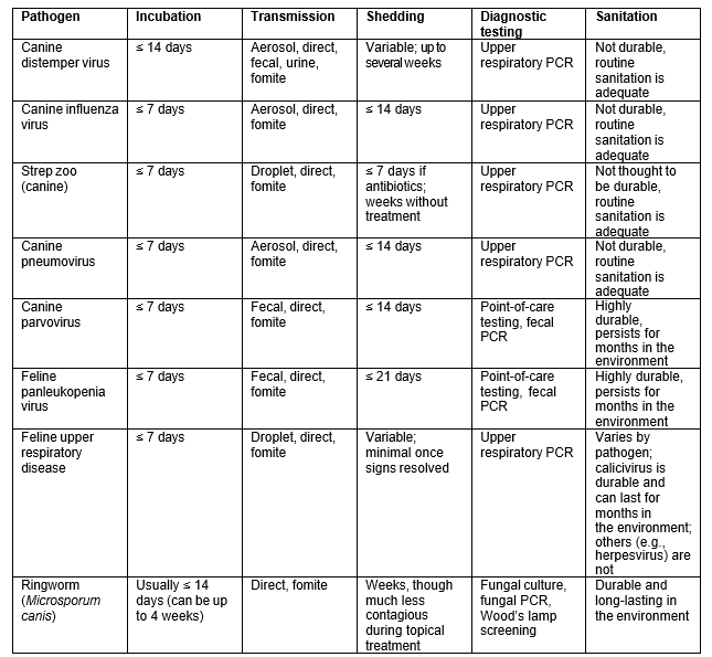 Diagnostic testing options, discussed in a later section, also vary by pathogen. Transmission of all pathogens can occur through direct contact between animals or objects that indirectly transmit the infective agent between animals (fomites). Common fomites in shelters include cleaning equipment, leashes, toys, food/water dishes, and, most commonly, staff who transmit disease-causing agents on their hands or clothing.